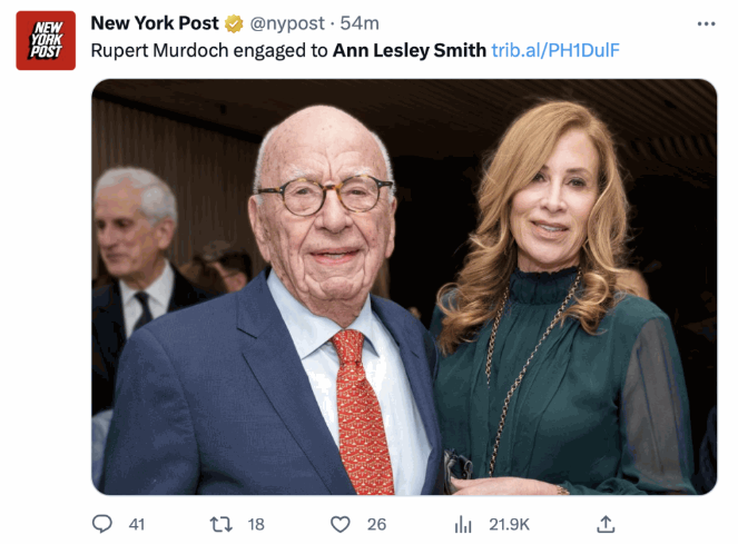 默多克擁有包括《泰晤士報》、《太陽報》和??怂剐侣劦榷嚅g大型傳媒,被喻為傳媒大亨,六個月前他與第四任太太、前超模杰瑞·霍爾 (Jerry Hall) 離婚,結(jié)束長達(dá)六年的夫妻關(guān)系。據(jù)報,作為離婚協(xié)議的一部分,霍爾獲得了一座價值 1100 萬英鎊的牛津郡豪宅和一處位于法國南部的住宅的鑰匙,以及一筆現(xiàn)金。