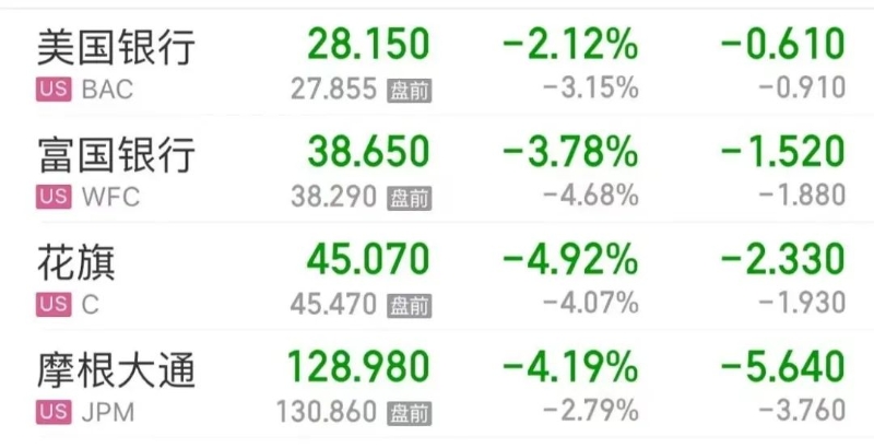美股地區(qū)性銀行股集體下挫,第一共和銀行跌超25%,西太平洋合眾銀行跌逾15%,阿萊恩斯西部銀行跌超7%。此外,美國(guó)銀行跌2.12%、富國(guó)銀行跌3.78%、花旗跌4.92%、摩根大通跌4.19%。