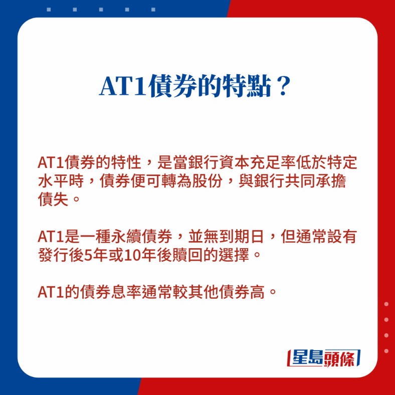 上海商業(yè)銀行研究部主管林俊泓表示,AT1在金融海嘯后引入市場(chǎng),其中原意是設(shè)計(jì)出一款新式產(chǎn)品,吸引更多不同取態(tài)的資金投資在銀行,亦可分散銀行融資途徑,而以其條款而言,在債市是偏向高風(fēng)險(xiǎn)、高回報(bào)的投資。