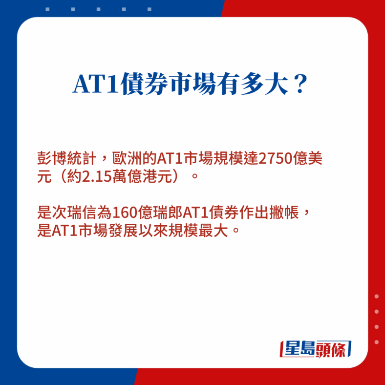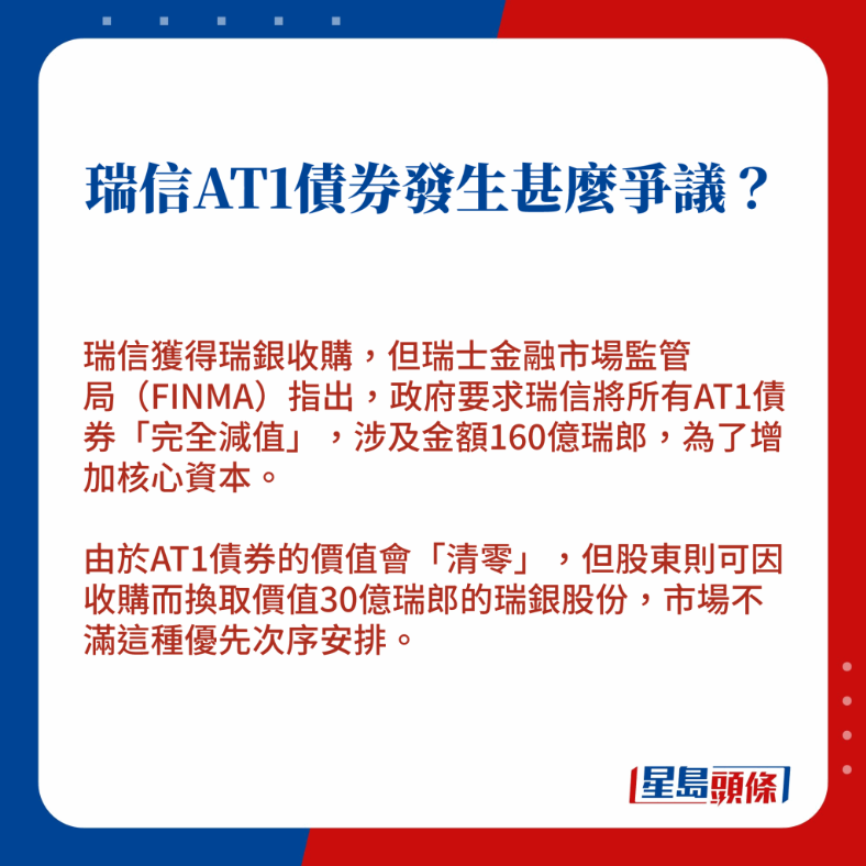 瑞信獲瑞銀收購(gòu)條件之一,是將瑞信價(jià)值160億瑞郎的額外一級(jí)資本(AT1)債券撇帳,一眾投資者如夢(mèng)初醒,手持債券頓成廢紙,激發(fā)AT1市場(chǎng)拋售潮。總部位于英國(guó)的匯控(005)亦受到牽連,其中一筆AT1債價(jià)最多急跌21%,股價(jià)亦成表現(xiàn)最差藍(lán)籌。一文看清AT1是什么、對(duì)匯控以至香港銀行的影響有多大。