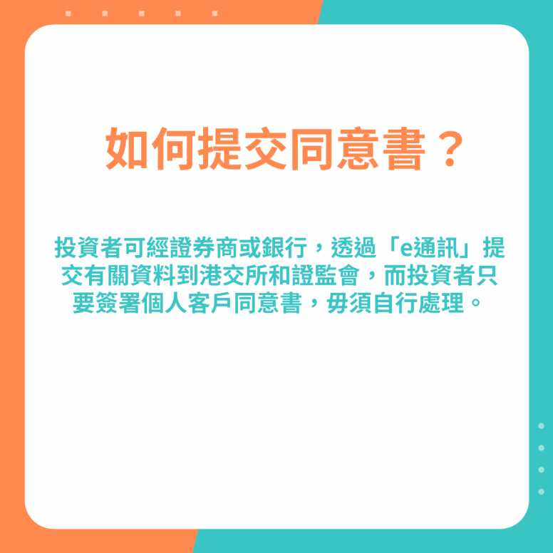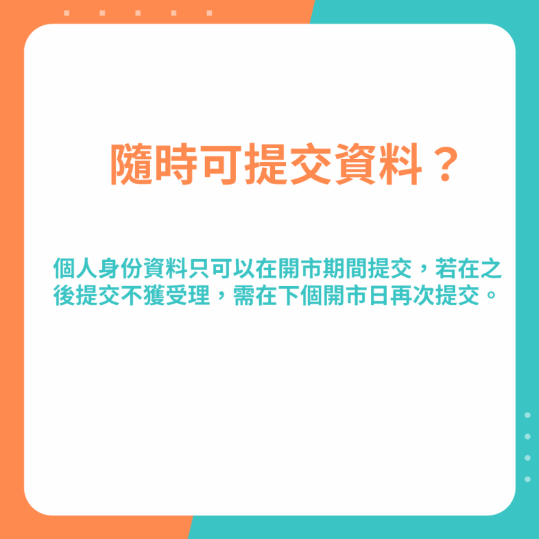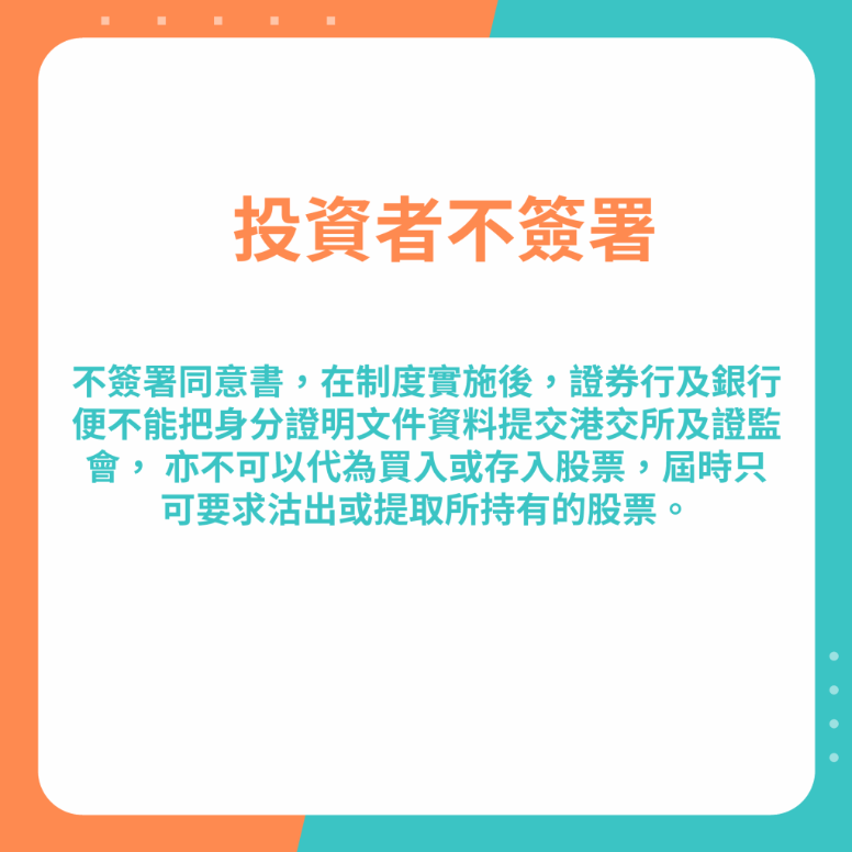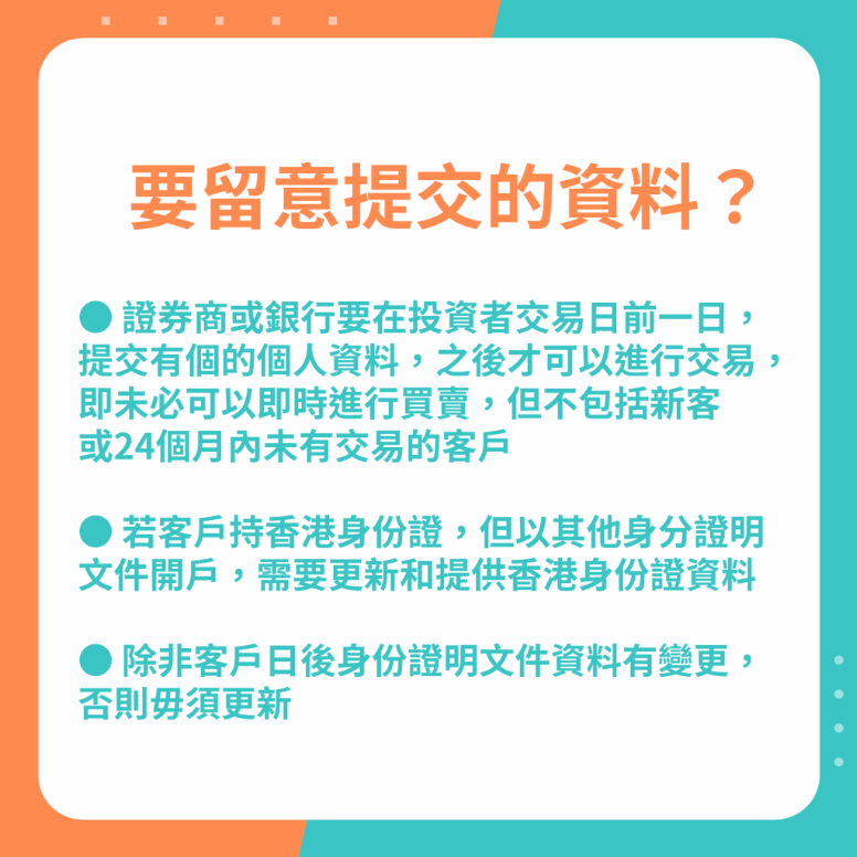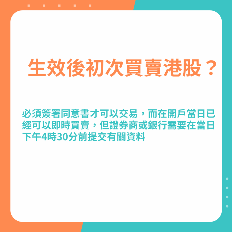 香港證券及期貨專業(yè)總會會長陳志華表示,新制度下星期一(20日)便正式生效,他親身嘗試提交資料,假設全部資料正確無誤,5至10分便生效。但他擔心即使客戶生效當日簽署,亦未必可以實時進行交易,或會存有延誤,因為記錄始終要經(jīng)港交所再發(fā)出確認,才可以買入港股。