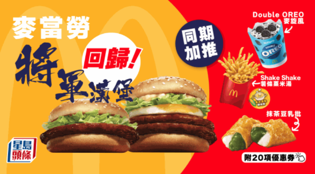 麥當(dāng)勞將軍漢堡回來了!大受歡迎的將軍漢堡/玉子將軍漢堡強(qiáng)勢(shì)回歸,3月23日起,即可再次享受麥當(dāng)勞將軍漢堡系列的經(jīng)典滋味。同期 Shake Shake薯?xiàng)l粟米湯味調(diào)味粉、白提子椰果梳打、Double OREO麥旋風(fēng)及抹茶豆乳批亦全面進(jìn)場(chǎng)!