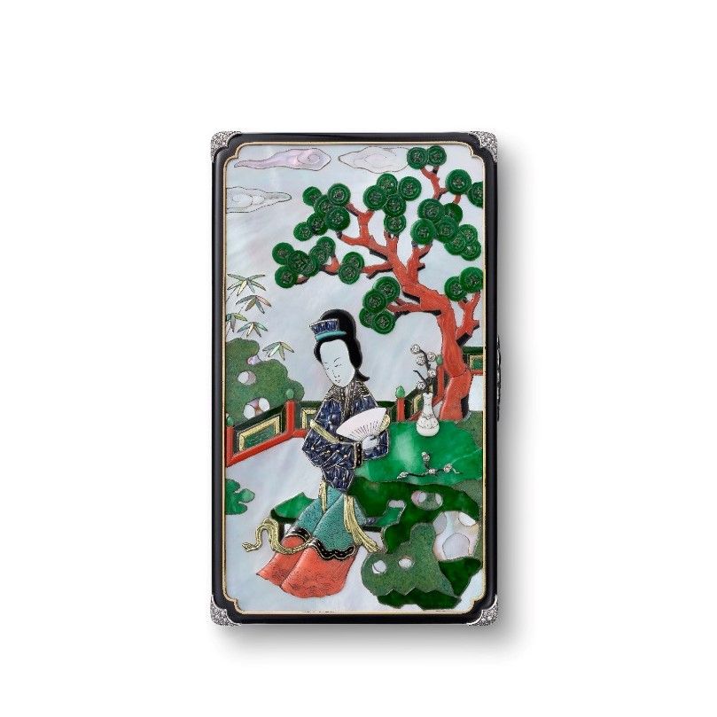 卡地亞于1928年依照路易.卡地亞與夫人(1895–1952年)曾收藏的一件清代康熙五彩庭院仕女圖瓷盤,制作的含中國風(fēng)格化妝盒。