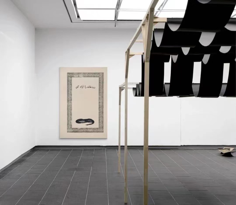 作為香格納畫(huà)廊在巴塞爾香港藝術(shù)展主推的藝術(shù)家,韓夢(mèng)云的作品占據(jù)了展位很大一部分空間?!兑骨愤@一作品由繪畫(huà)和大型裝置組成,是韓夢(mèng)云近年來(lái)不斷打磨的重要作品。黑色的侗族亮布懸在支架之上。在白色的背景之下,宛若飄浮在空中十分顯眼。