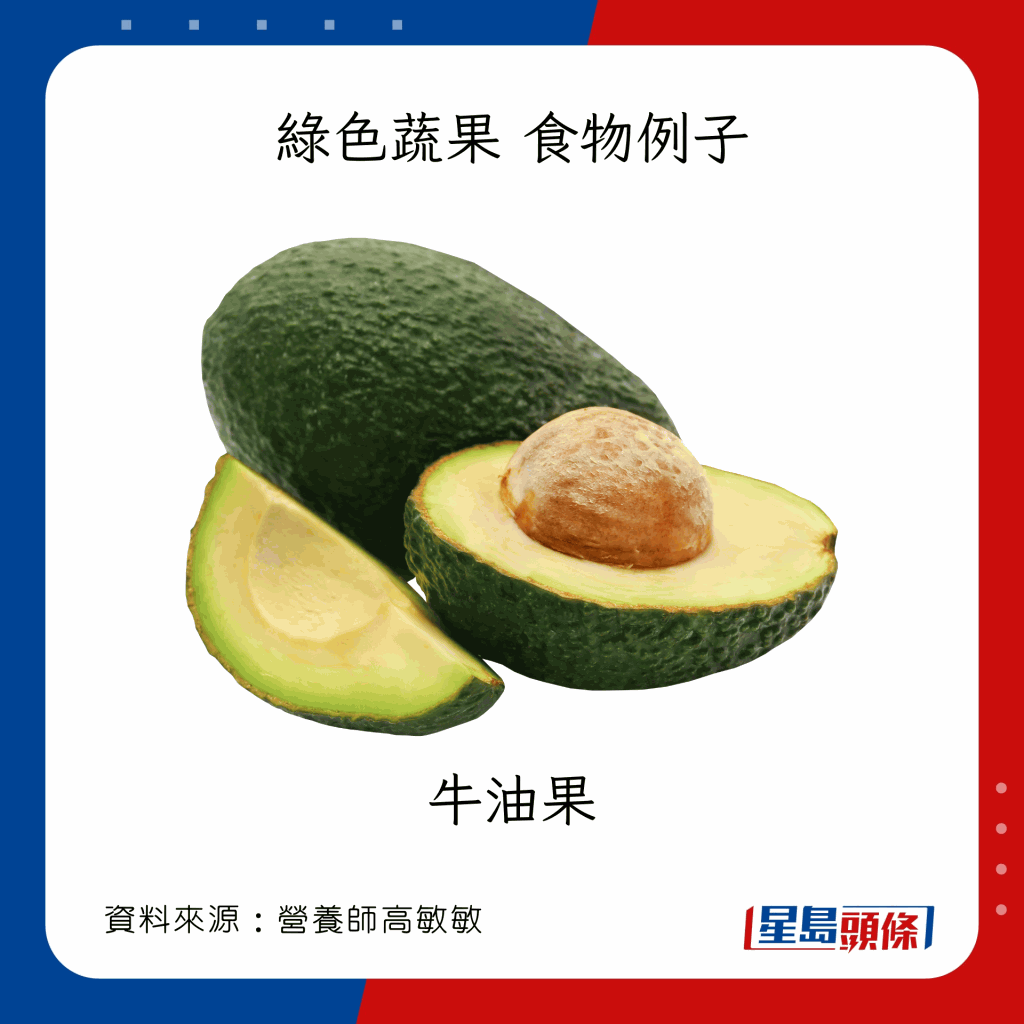 食物例子:牛油果、番石榴、奇異果、綠色蔬菜類