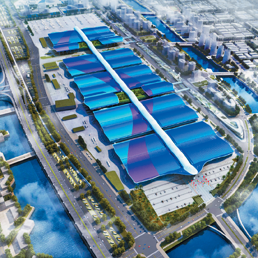 深圳國際會展中心位于廣東省深圳市寶安區(qū)福海街道展城路1號,項目一期于2019年9月全面建成,總建筑面積達160萬平方米,有19個展廳和一個室外展場,室內(nèi)展覽面積達40萬平方米。展館采用長條形“魚骨式”布局,19個展廳沿2層中央廊道對稱排列,待“魚頭”整體建成后,室內(nèi)展覽總面積達50萬平方米,每個展廳占地約2.6萬平方米,將是全球最大的會展中心。