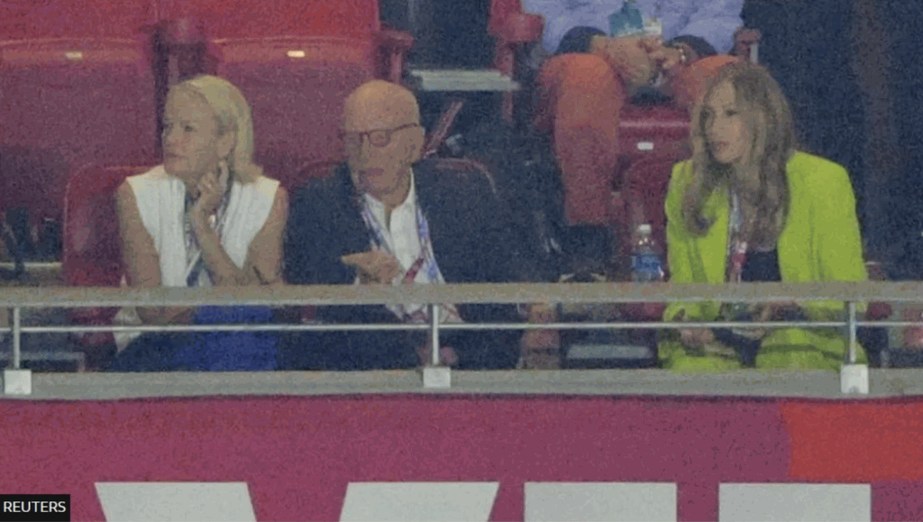 ▲默多克與安·萊斯利·史密斯(右)、女兒伊麗莎白(左)一起在看臺上觀賞球賽。 路透社