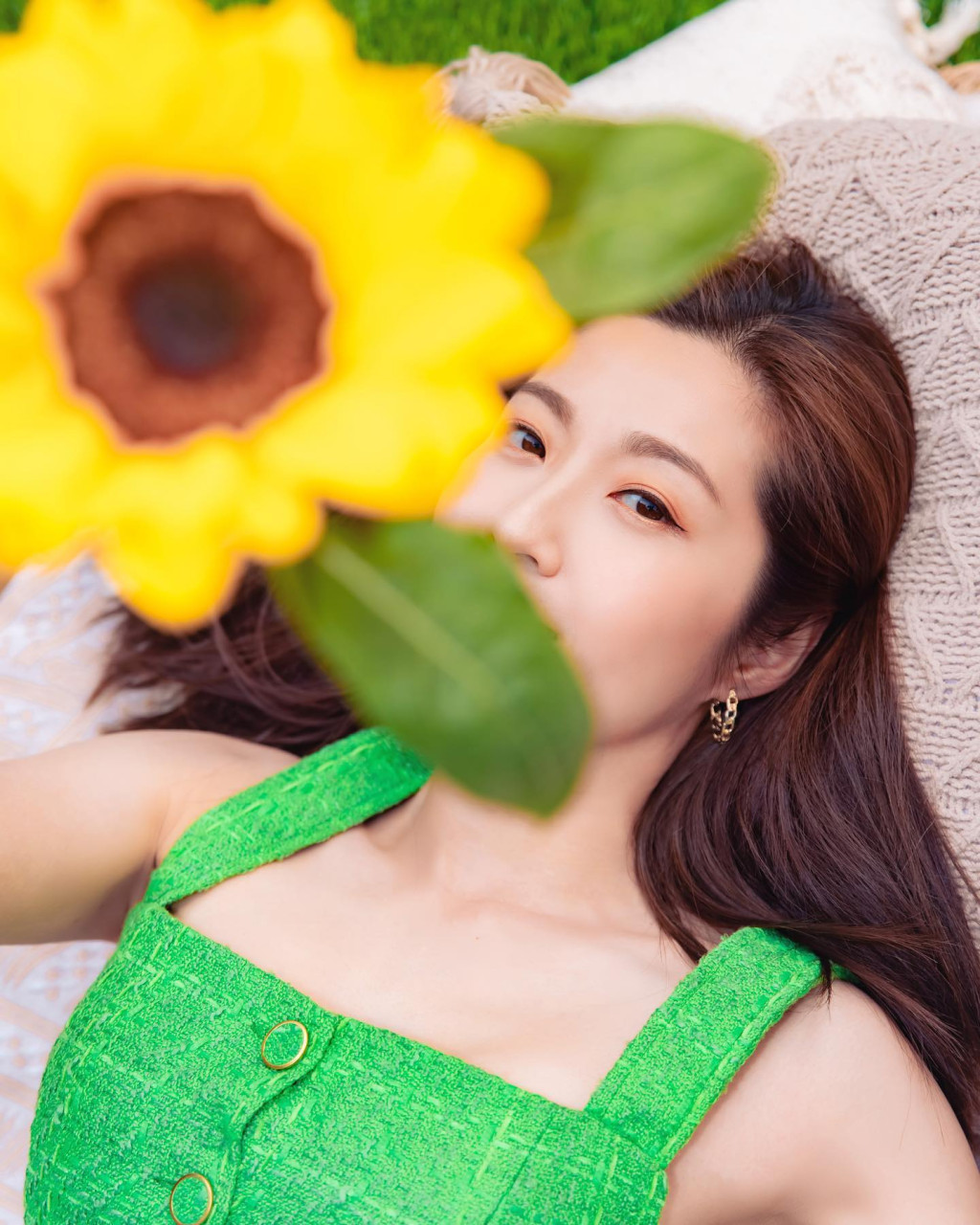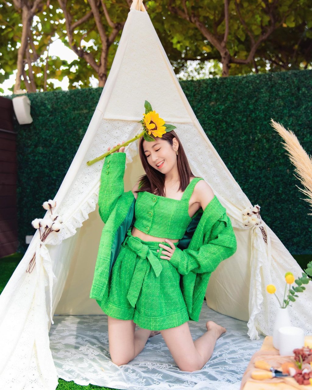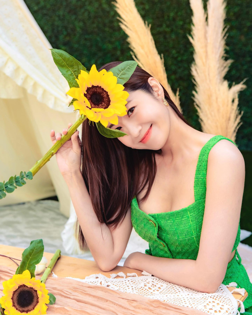 ▲陳自瑤拎住支太陽(yáng)花擺出各種Pose。