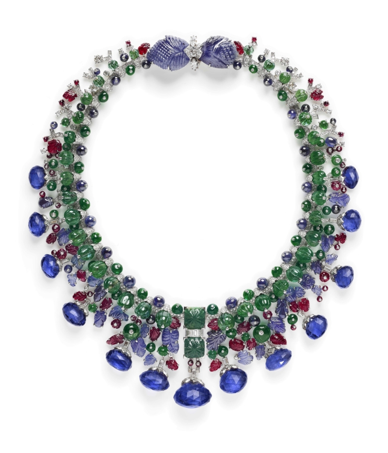 ▲印度風格項鏈??ǖ貋啺屠瑁?936年制作,1963年改款。鉑金、白金、鉆石、藍寶石、祖母綠、紅寶石。特別訂制,卡地亞典藏。來源:黛絲.法羅斯(1890–1962年),勝家衣車公司繼承人。Vincent Wulveryck, Collection Cartier ?Cartier
