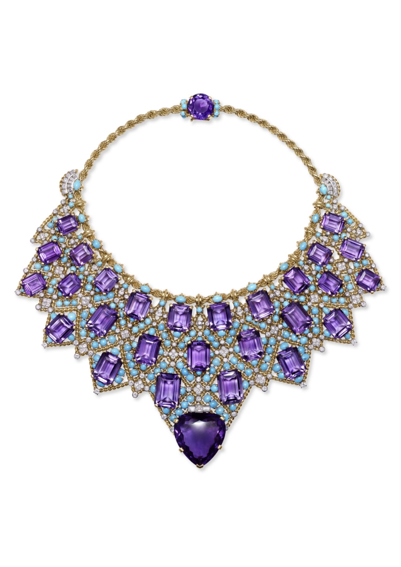 ▲項鏈??ǖ貋啺屠瑁?947年。金、鉑金、鉆石、紫水晶、綠松石。特別訂制,卡地亞典藏。來源:溫莎公爵夫人(1896–1986年)Nils Herrmann, Collection Cartier ?Cartier