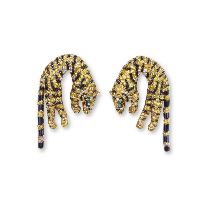 ▲虎形耳夾(一對)。卡地亞巴黎,1961年。金、鉆石、祖母綠、縞瑪瑙。特別訂制,卡地亞典藏。來源:芭芭拉.赫頓(1912–1979年), 美國零售商伍爾沃斯百貨繼承人。Nils Herrmann, Collection Cartier ? Cartier
