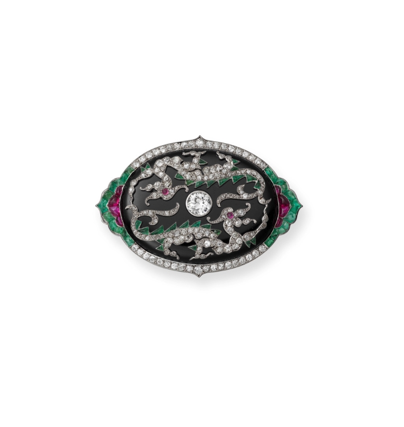 卡地亞于1919年制作其歷史上第一件帶中國道家太極紋飾“陰陽”的鏈墜;法國高級訂制時裝設計師珍妮.派昆(Jeanne Paquin ,1869–1936年)于1920年獲贈飾有中國傳統(tǒng)紋樣“雙龍戲珠”的卡地亞胸針;美國社交與時尚界名媛芭芭拉.赫頓(Barbara Hutton,1912–1979年)于1933年結婚時獲贈的卡地亞項鏈,其所用的翡翠,正是中國人喜愛的名貴寶石。
