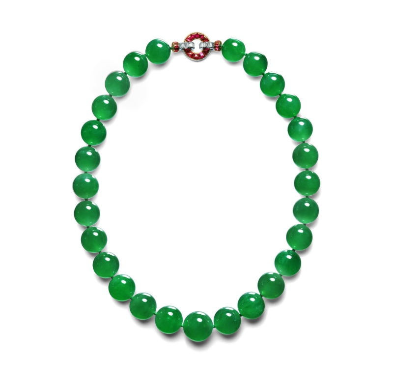 ▲項鏈。卡地亞巴黎,1934年。翡翠、鉑金、金、鉆石、紅寶石。特別訂制,卡地亞典藏。來源:芭芭拉.赫頓(1912–1979年),美國零售商伍爾沃斯百貨繼承人。Marian Gérard, Collection Cartier ?Cartier