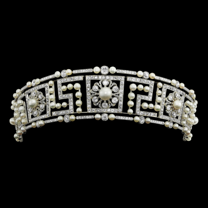 ▲冠冕。卡地亞巴黎,1906年。鉑金、鉆石、天然珍珠。演員劉嘉玲惠借。Marian Gérard, private collection ?Cartier