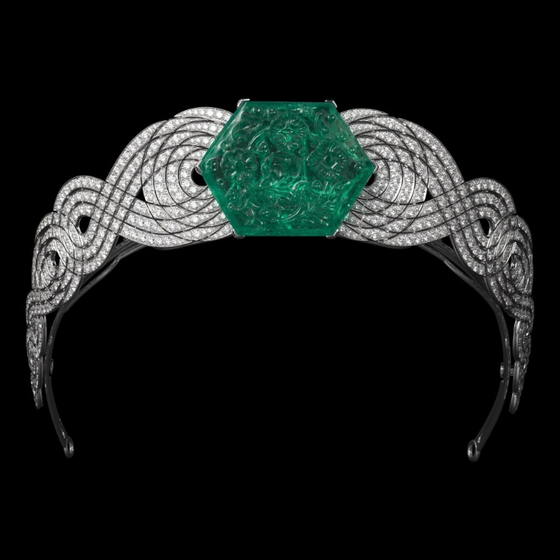 ▲泰姬陵祖母綠冠冕(可拆分為胸針)??ǖ貋啠?012年 鉑金、鉆石、祖母綠。女企業(yè)家何超瓊惠借。Vincent Wulveryck ?Cartier