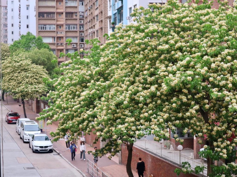 在太子道西及界線街一帶,種有逾30棵魚木樹,最近踏入盛開花期,魚木花紛紛綻放,米黃及淺白的鮮花組成一簇簇花球,茂密程度有如瀑布!記者親身來到現(xiàn)場發(fā)現(xiàn)有一大半魚木樹經(jīng)已開花,相信待至滿開時,太子道西將化身成美麗黃白花海步道。