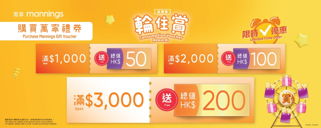 消費(fèi)券優(yōu)惠3:萬(wàn)寧禮券優(yōu)惠 $1000送$50、$3000送$200