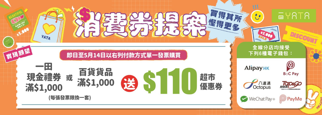消費(fèi)券優(yōu)惠9:一田消費(fèi)券 精選貨品4折起 送$110超市現(xiàn)金優(yōu)惠券