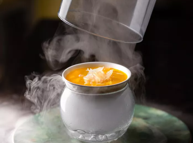 餐廳的英文名源于古人在絲綢之路的貿(mào)易往來,室內(nèi)設(shè)計同樣帶有傳統(tǒng)氣息,客人可以在茶廊品嘗功夫茶,以及一系列特色茶制酒釀。主廚擁有逾三十年經(jīng)驗,他帶同四川團(tuán)隊,以各種家鄉(xiāng)香料和新鮮食材,呈現(xiàn)川菜的不同風(fēng)味。菜品中不乏工序繁多的手工菜,例如以人手剁蓉、造型精致的鍋貼豆腐。