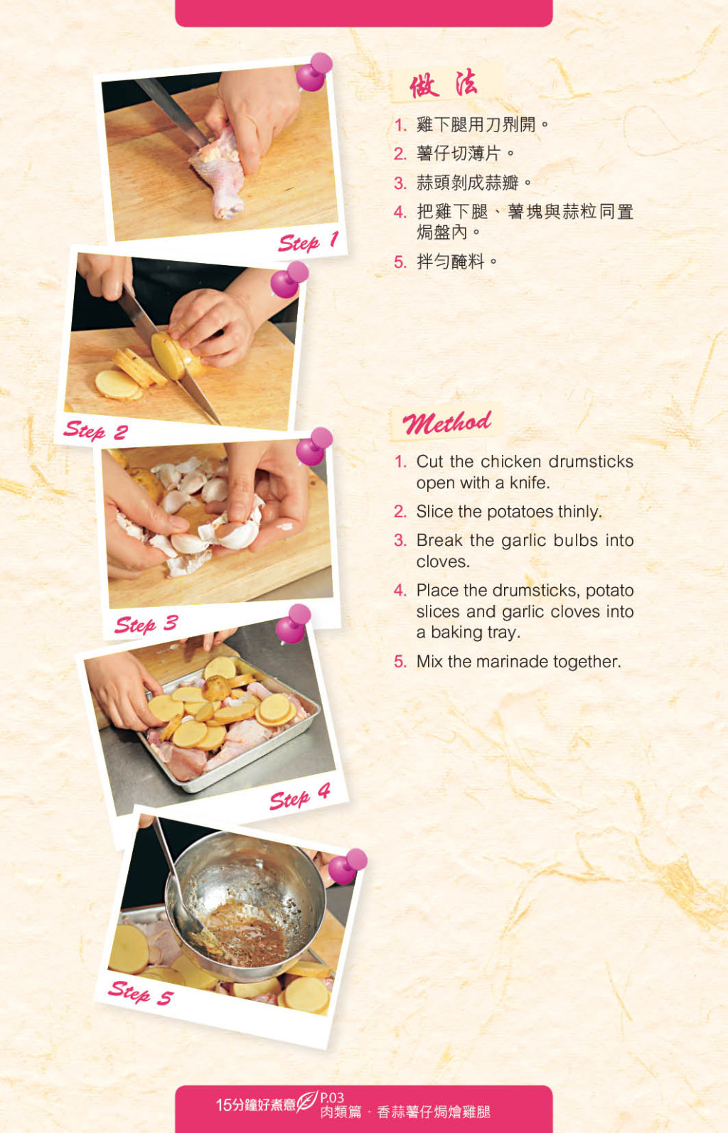 雞肉是常用食材,在家烹調(diào)雞饌家常菜,只要配合不同煮法、配料和調(diào)味料,便可做出千變?nèi)f化的家常雞饌。今日教大家烹調(diào)三款不同風(fēng)味的家常菜雞饌,包括英式、臺(tái)式及港式,做法簡(jiǎn)單,輕易為家人炮制滋味家常菜。