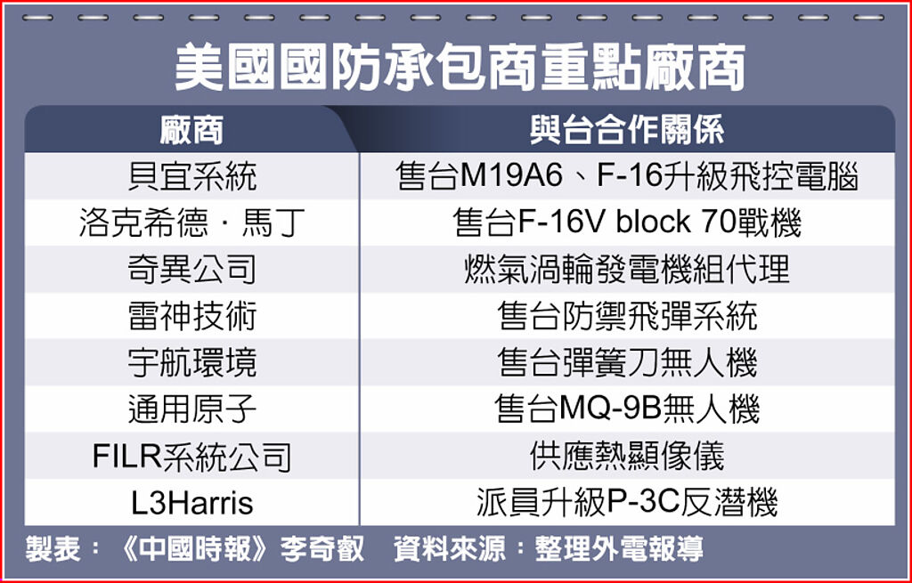▲美國軍火商重點廠商