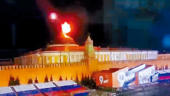 ▲影片截圖可見飛行物體飛近克里姆林宮元老院(總統(tǒng)辦公處)的圓頂時,爆出火光并冒煙。
