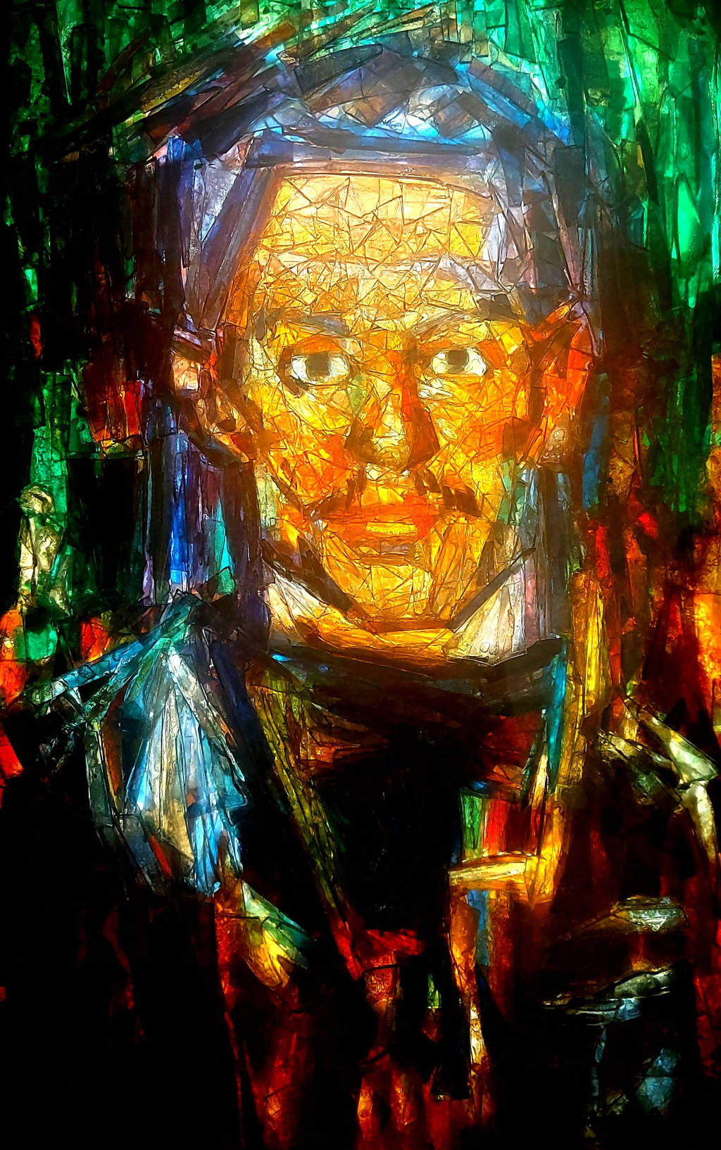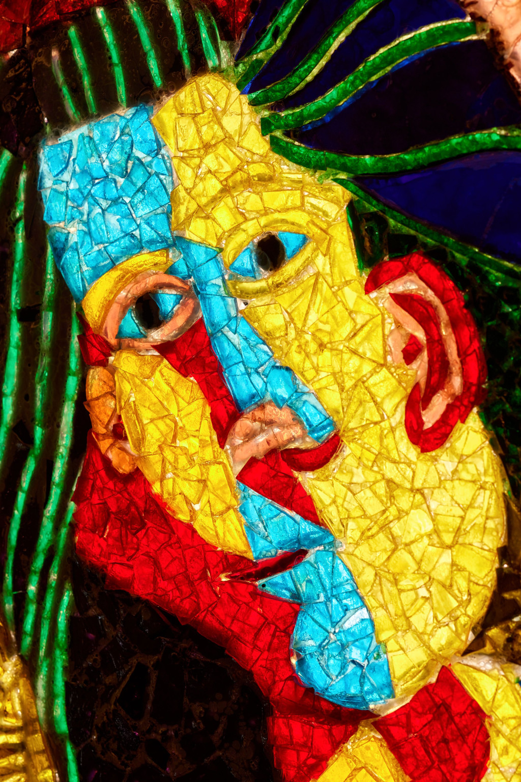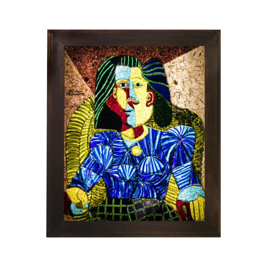 這些玻璃畫以6至7層不同色彩的玻璃粒塊拼制,在燈效下顯得剔透而立體,看來瑰麗迷人。是次展出的6幅作品,涵蓋了畢加索不同時(shí)期的創(chuàng)作風(fēng)格,主角都是他最親密或影響至深的人,當(dāng)中包括早期作品如《女王伊莎貝爾》及《女人半身像》,尤其是后者,意念來自他備受爭議的代表作《阿維農(nóng)的少女》,畫中人尖長的面孔,正是畢加索受到非洲面譜所啟發(fā)的創(chuàng)作風(fēng)格呈現(xiàn),有別于我們熟悉的立體主義畫風(fēng)。
