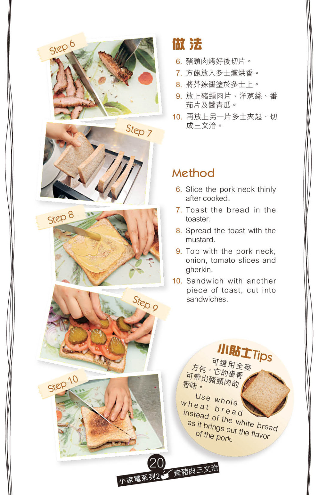 三文治餡料千變?nèi)f化,非局限于火腿、雞蛋、芝士等常用食材,今日教大家做的“咖喱雞肉沙拉三文治”、“烤豬肉三文治”,選用鮮肉炮制,并加入不同的醬料、配料調(diào)味,味道濃郁又營養(yǎng)豐富。另一道“明治牛肉卡巴串燒”入口都是肉,烤至香口美味,可作小食、伴飯或面條。