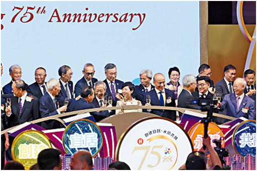 ▲2023年4月17日,房協(xié)舉行75周年慶祝酒會(huì),由房屋局局長(zhǎng)何永賢(中)及房協(xié)主席陳家樂(lè)(下排左2)主禮。