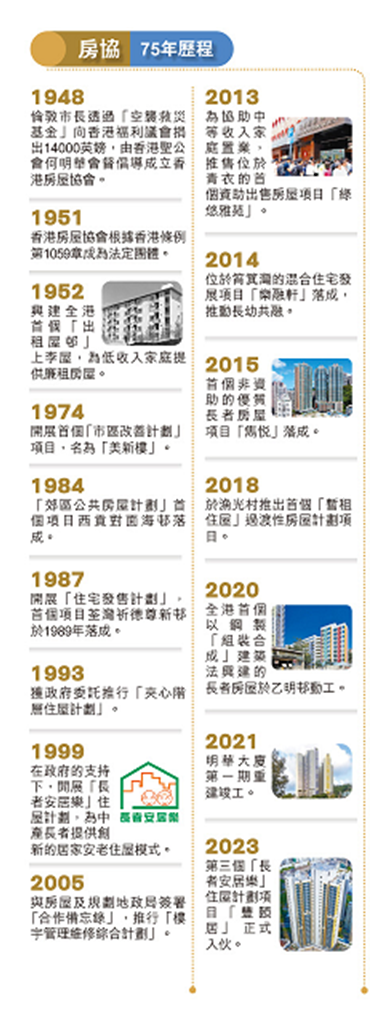 于1948年成立的香港房屋協(xié)會(huì)(房協(xié)),是香港首個(gè)非政府房屋機(jī)構(gòu),作為“房屋實(shí)驗(yàn)室”,肩負(fù)建屋惠民的社會(huì)使命。75年來(lái),房協(xié)一直透過(guò)創(chuàng)新思維,為市民的住屋需要開(kāi)創(chuàng)各種房屋計(jì)劃,由第一個(gè)出租屋邨上李屋,到最近落成的“長(zhǎng)者安居樂(lè)”住屋計(jì)劃項(xiàng)目豐頤居,至今已完成100個(gè)項(xiàng)目,提供超過(guò)74,000個(gè)住宅單位。