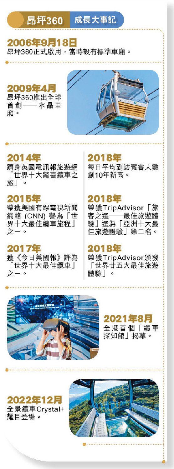 乘搭“昂坪360”纜車將大嶼山的迷人景觀一覽無遺,結(jié)合昂坪市集,加上推出于法國及意大利研制的“全景纜車Crystal+”,大大提升賓客的旅游體驗(yàn)。“昂坪360”是香港獨(dú)一無二的旅游品牌,創(chuàng)立16年,享譽(yù)國際,吸引大批外地及本地旅客到訪,為賓客留下獨(dú)特的旅游回憶。