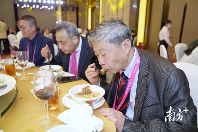 來自馬來西亞的葉玟豪祖籍廣東汕尾,談及家宴的菜式,他如數(shù)家珍:“陳皮骨、山坑魚仔、黃鱔飯,吃過了這么多地方的美食,粵菜始終是最暖心的味道。”在晚宴門外的僑都預(yù)制菜展示區(qū),他驚喜地發(fā)現(xiàn)了預(yù)制盆菜:“等下個團圓節(jié)日,我要把這份家鄉(xiāng)味道與家人分享。”