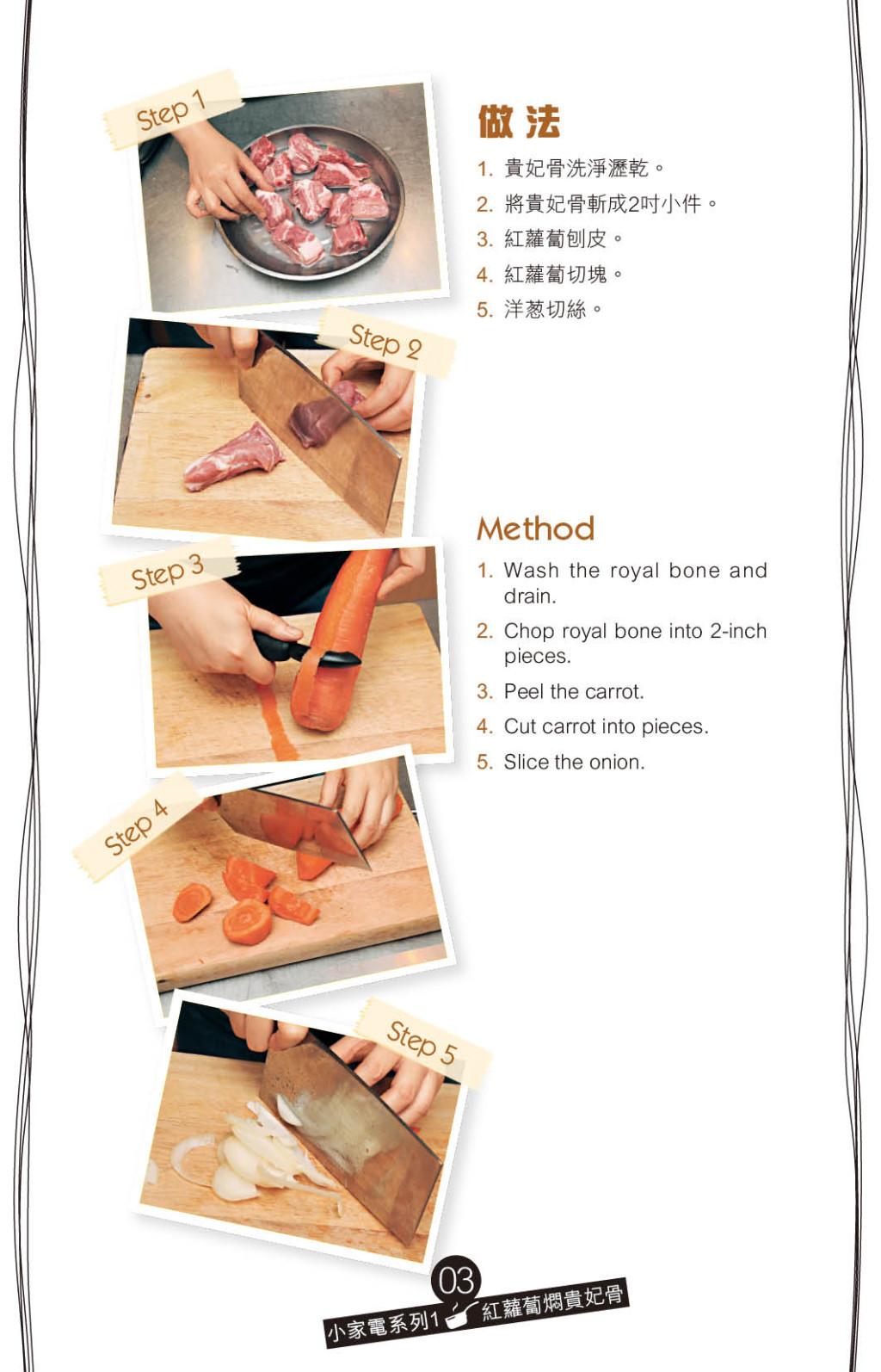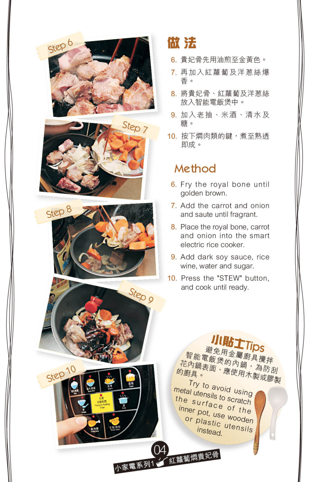 智能電飯煲多功能,可煮飯又可煮菜,例如紅蘿卜燜貴妃骨,調味料簡單,以紅蘿卜及洋蔥的清甜來提升肉香,簡單用智能電飯煲烹調,快捷方便,若用明火燜煮的方法也一樣,但需時較長。