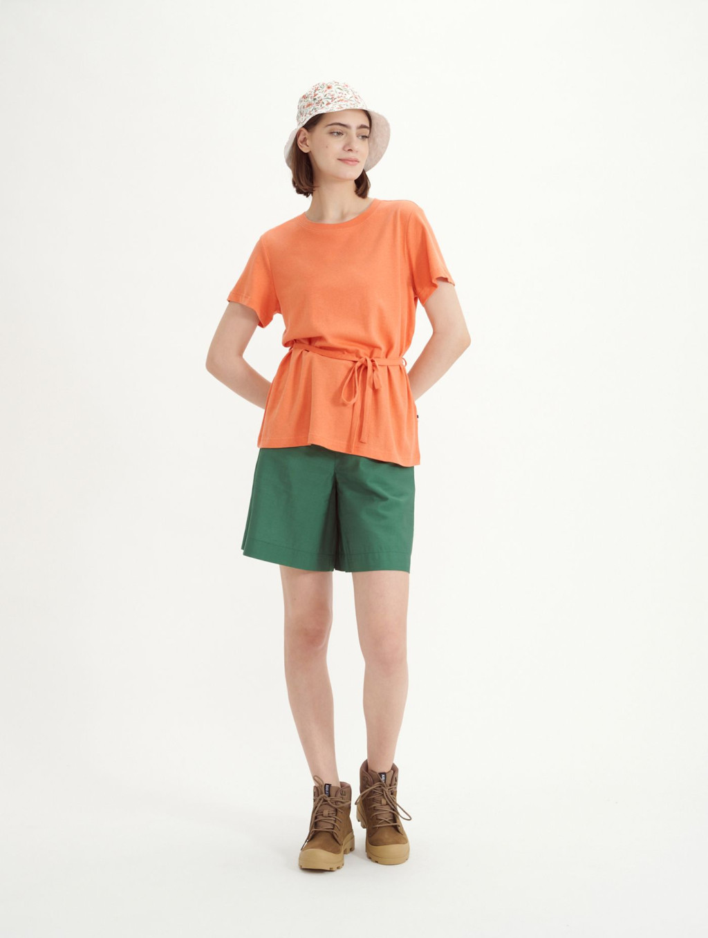 ▲女裝橙色麻混棉束腰UV Control T恤/$980/Aigle,會員購物滿$3,500獲贈防紫外線折迭雨傘。