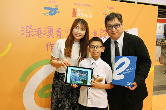 ▲道教青松小學(xué)(湖景邨)校長吳思銘(右),指導(dǎo)老師伍靜雯(左)與新星組銅獎(jiǎng)得主馬爾希(中)合照。馬爾希表示他的“自游深港澳”駕駛游戲,包含了三地的地圖、著名景點(diǎn)以及每個(gè)地方的特色,可幫助玩家更好地了解每個(gè)地方的文化特色及旅游景點(diǎn)。