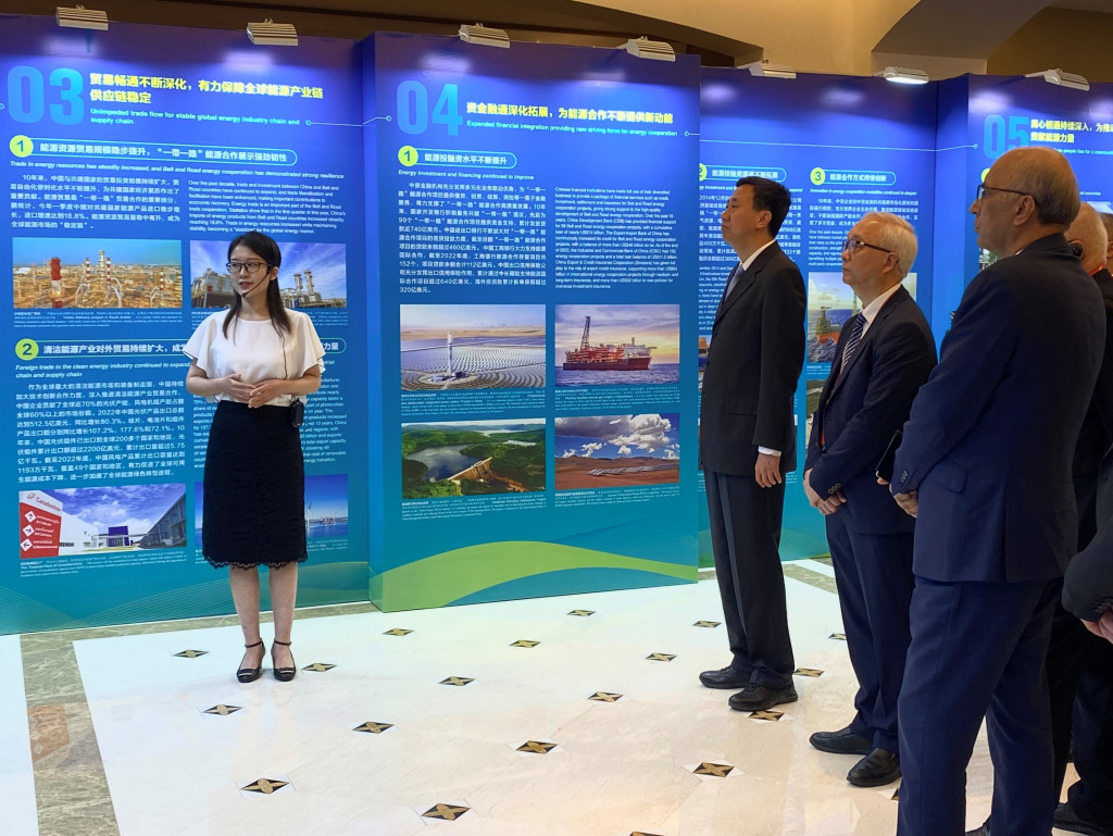 ▲謝展寰(右二)與國家能源局副局長任京東(右三),以及其他國家代表一同參觀會場特設的“一帶一路”能源合作十周年主題展覽。(政府新聞處)