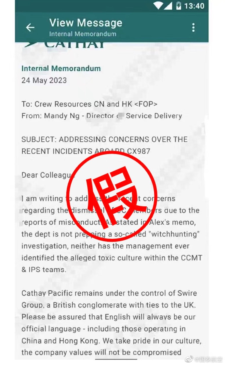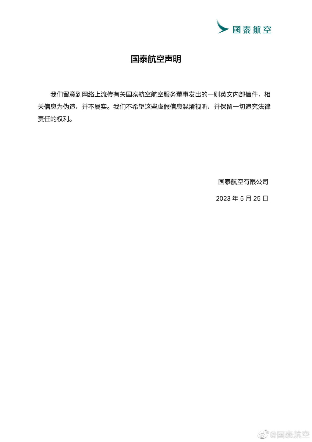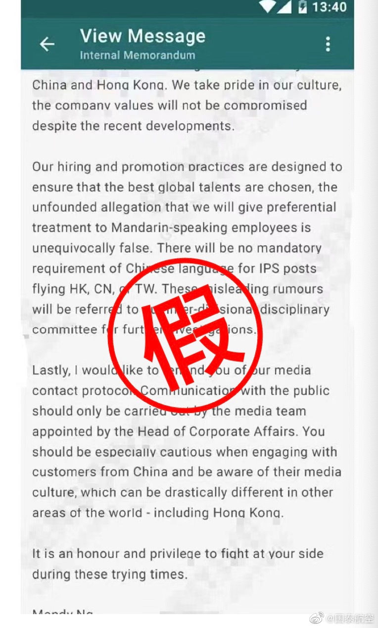 惟國泰航空實時在官方微博發(fā)帖澄清:“我們留意到網(wǎng)絡(luò)上流傳有關(guān)國泰航空航空服務(wù)董事發(fā)出的一則英文內(nèi)部信件,相關(guān)信息為偽造,并不屬實。我們不希望這些虛假信息混淆視聽,并保留一切追究法律責(zé)任的權(quán)利。 ”