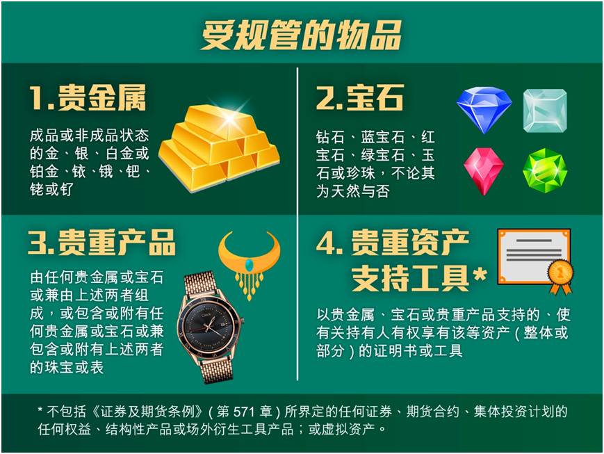 注冊制度中受規(guī)管的物品不限于貴金屬及寶石,當(dāng)中還涉及了貴重產(chǎn)品及貴重資產(chǎn)支持工具。詳情如下: