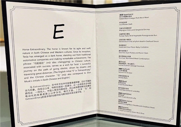 菜單內(nèi)頁則字母“E”作主圖,十分醒目,繼而用中英雙語介紹了“馬”的含義,以及祝愿特斯拉在通往電動化的發(fā)展道路上以夢為馬、橫行萬里。