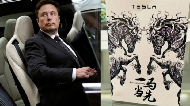 網(wǎng)傳菜單封面上,有兩匹馬圖案、英文“TESLA”、漢字“一馬當先”與英文“Extraordinary”