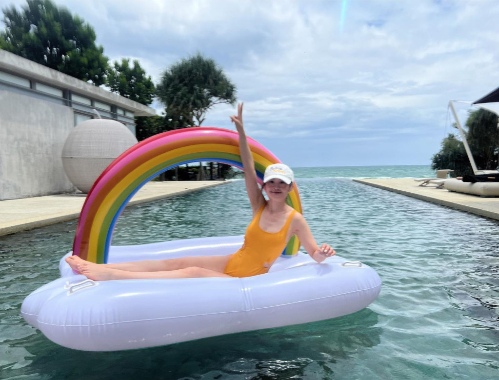 ▲阿Sa躺在彩虹浮床上舉V手勢(shì)。