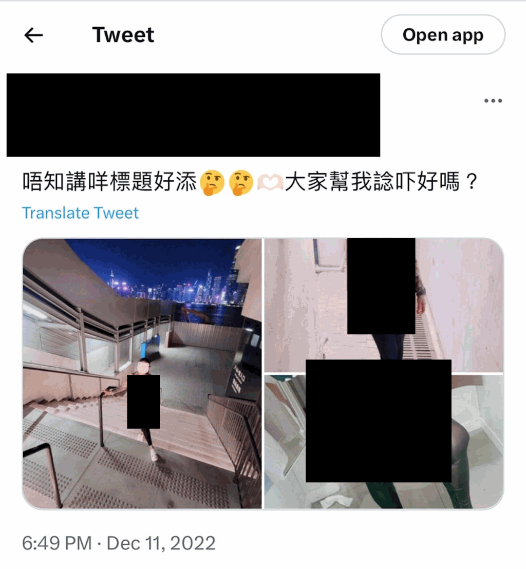 消息稱,被捕女子為餐廳服務員,家住觀塘翠屏北村,已婚,有3名子女。她在其twitter帳號上聲稱自己是“良家婦女”,但“喜歡露出”,又形容自己樣貌身材普通。去年中起她多次在上傳多張裸露胸部的相片,更配以具挑逗性的句子。