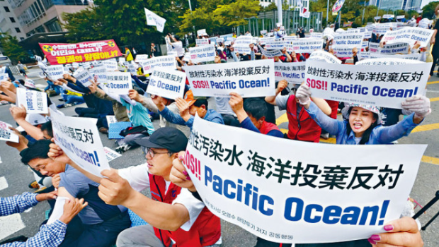 ▲一群韓國漁民日前在首爾國會大樓外集會,抗議日本計劃排放福島核廢水入海。