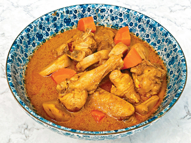 娘惹菜系融合中國和馬來烹飪風(fēng)格,娘惹咖喱而言,復(fù)合香料集甜、酸、辛、辣、香等多種風(fēng)味,味道濃郁而富深度。新加坡朋友解釋,娘惹咖喱雞在當(dāng)?shù)孛考颐繎糇龇杂兴鶆e,有的更自家炮制娘惹咖喱醬,朋友家做的娘惹咖喱雞則取簡易快捷,選用集茴香、八角、荳蔻等香料于一身的即食娘惹咖喱粉,再自行額外添加乾蔥及香料提升香氣。朋友憶述兒時炮制娘惹咖喱雞,常往隔壁鄰居花園的咖喱樹採摘咖喱葉,以便拌入烹調(diào),咖喱葉濃烈的香氣,以及鮮榨濃椰漿的清香和順滑質(zhì)感,更是娘惹咖喱的靈魂。朋友家的娘惹咖喱雞,湯汁質(zhì)感較Soupy,吃罷雞塊還直接喝一兩口湯汁回味。朋友娓娓道出她的祖母來自上海,因此家中的娘惹咖喱雞做法特色是混合竹筍,正好反映她祖母的血緣。傳到朋友這一代,她特意添加紅蘿卜,全因朋友年輕時曾在東京工作,亦是出于對日本咖喱和從前的思念。