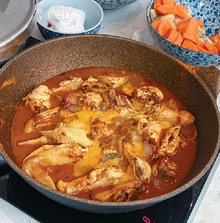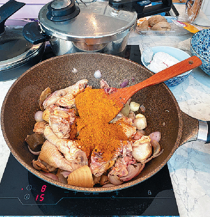 朋友示范的家常娘惹咖喱雞做法簡單,爆香香料再煎香雞塊,拌勻咖喱料及高湯烹調(diào),加入薯仔和佐料后拌入鮮濃椰漿便成。