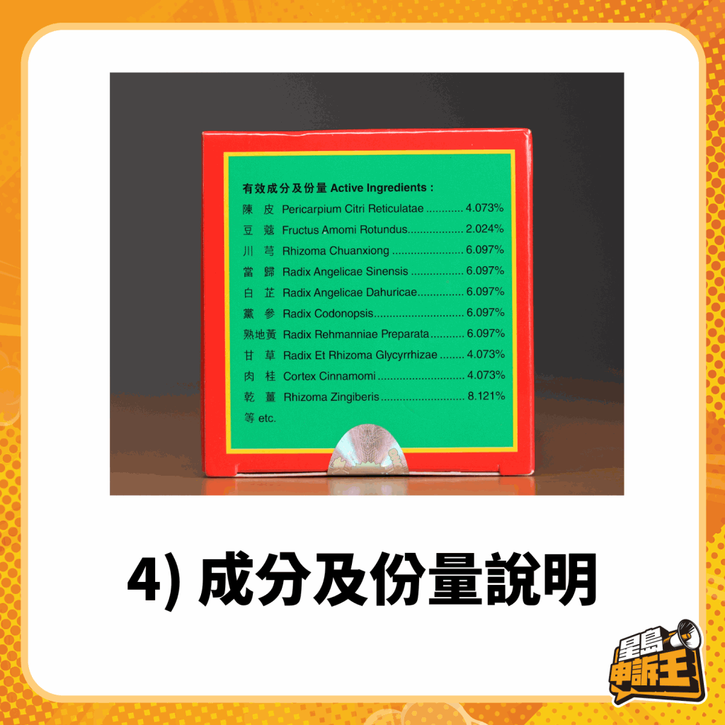 特征四:成分及份量說明。包裝盒底部清晰地印上該藥款包含的有效成份及份量。