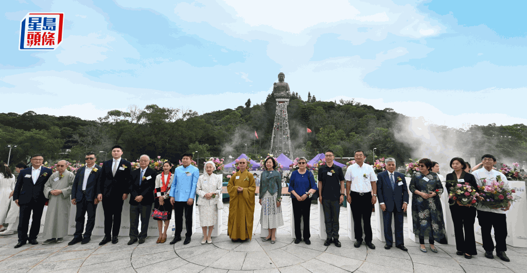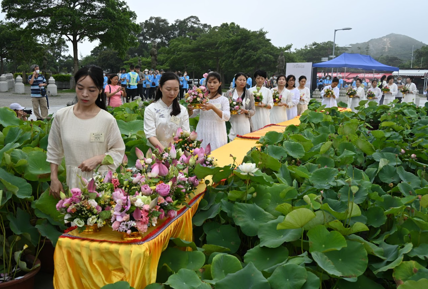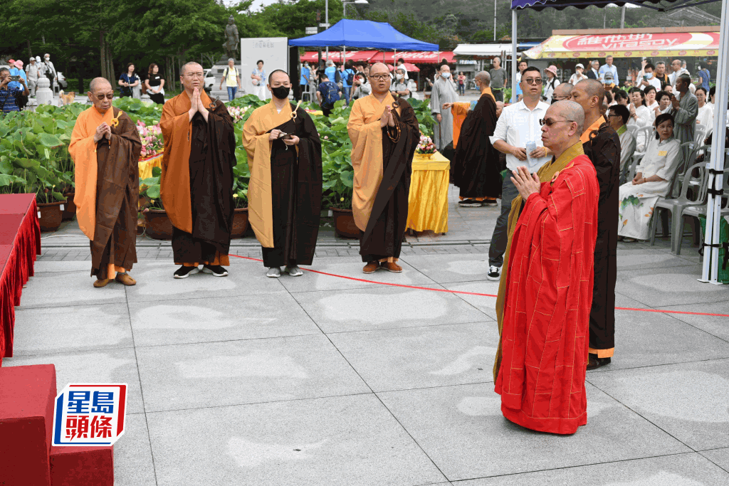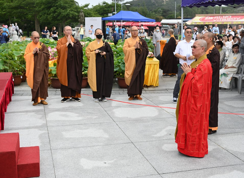 ▲凈因大和尚向著天壇大佛合十參拜,祈愿“盛世荷花·福佑香江”2023香港荷花展活動(dòng)順利進(jìn)行。