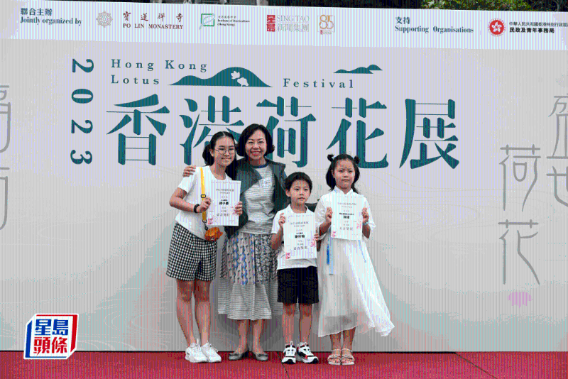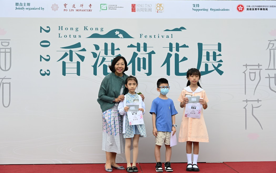 ▲民政及青年事務(wù)局局長(zhǎng)麥美娟與荷花展繪畫比賽的得獎(jiǎng)小學(xué)生合照。