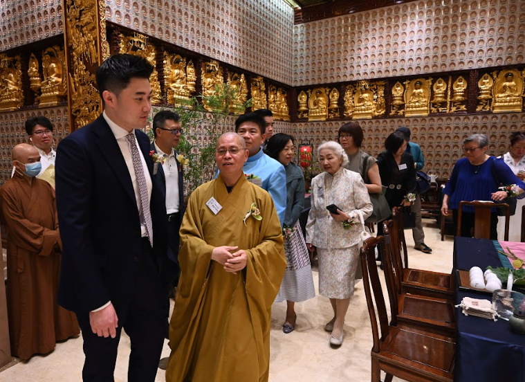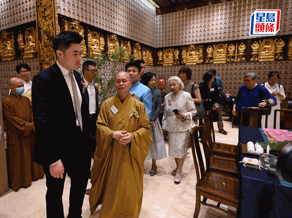 ▲凈因大和尚和星島新聞集團(tuán)執(zhí)行董事兼行政總裁蔡晉博士,以及范徐麗泰、梁愛(ài)詩(shī)等一眾來(lái)賓,參觀茶藝展和花藝展。