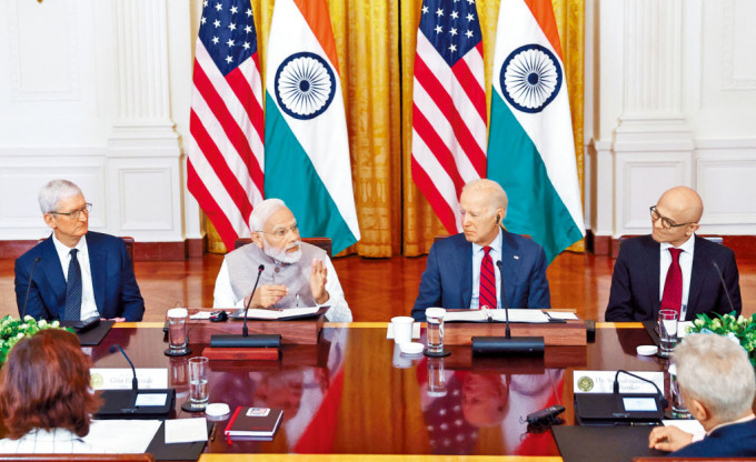 莫迪(左二)與拜登周五在白宮會晤蘋果行政總裁庫克、微軟行政總裁納德拉等企業(yè)高層。
